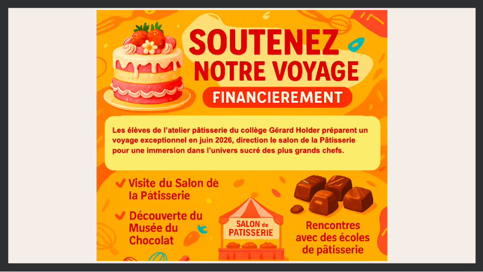 Soutenez les actions pour le voyage scolaire au salon de la pâtisserie (juin 2026). Soutenez (…)