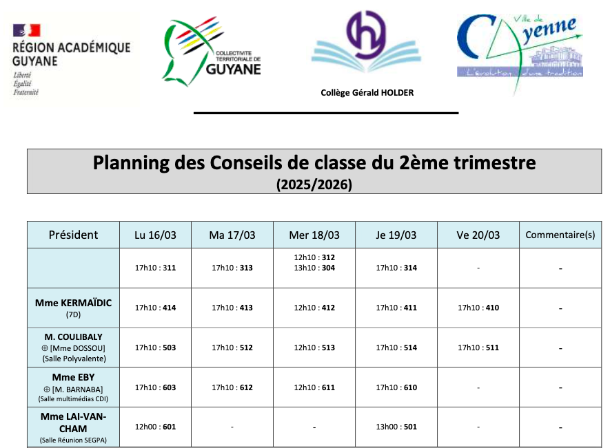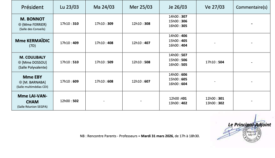 Les conseils de classe du 2e trimestre auront lieu du lundi 16 au vendredi 27 mars 2026. Rencontre parents/professeurs le mardi 31 mars 2026 à 17h.