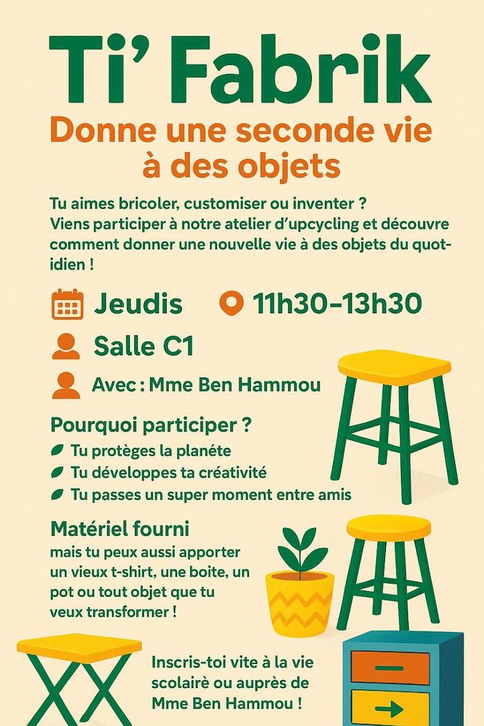 Tous les jeudis de 11h30 à 13h30 en C1 (salle d’Arts Plastiques), venez découvrir l’atelier Upcycling. L’objectif de cet atelier est de récupérer toutes sortes de matériaux et objets dont on ne sert plus pour créer des objets ou des produits de qualité supérieure et ainsi, qu’ils gagnent en valeur. Cette démarche citoyenne non seulement protège notre environnement mais fait aussi appel à notre créativité en stimulant nos neurones pour trouver un nouvel usage à un objet donné.